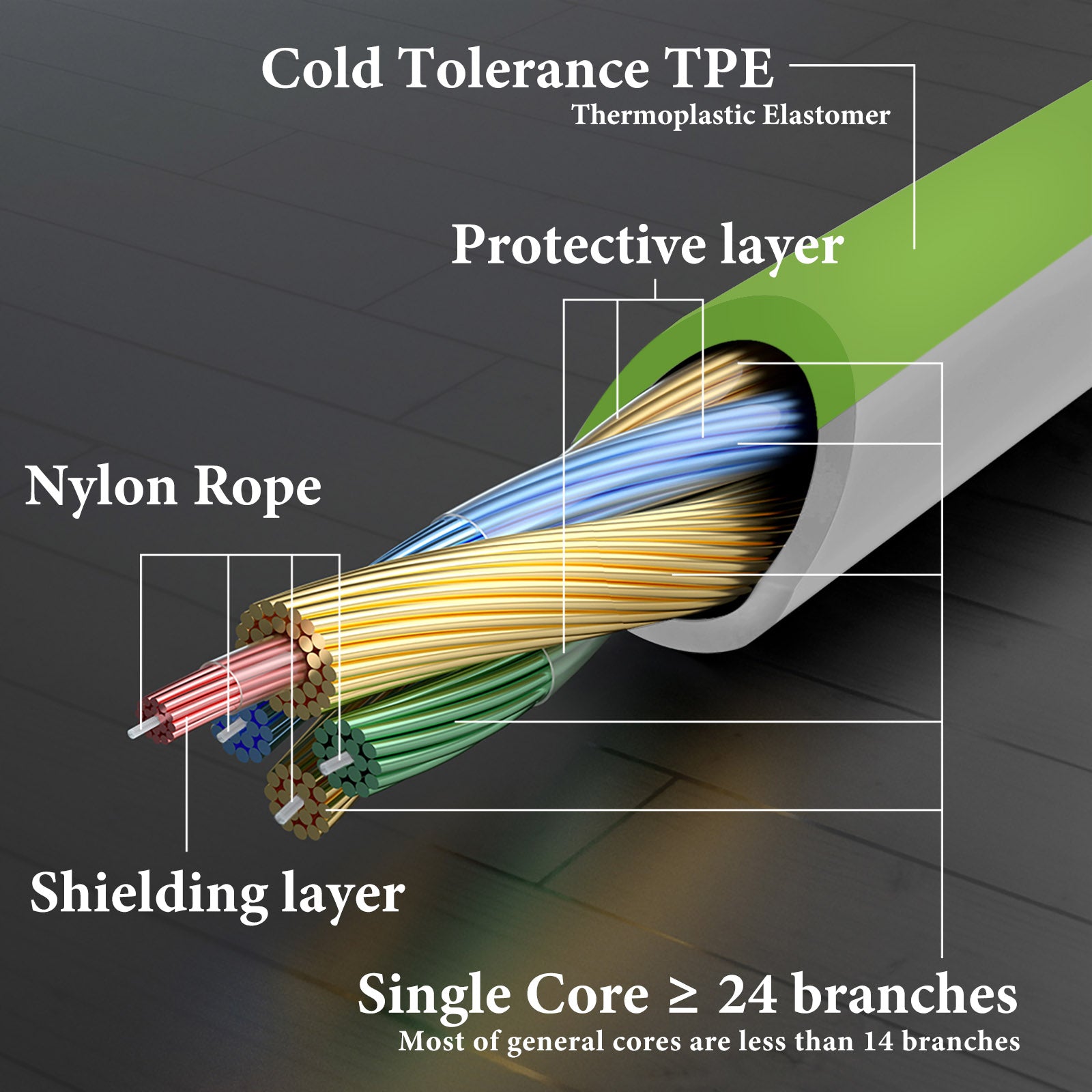 - Thermoplastic Elastomer (TPE) ensure the superior audio transfer against electron magnetic or radio interference (EMI or RFI), extreme cold or hot temperature and maximum protection.