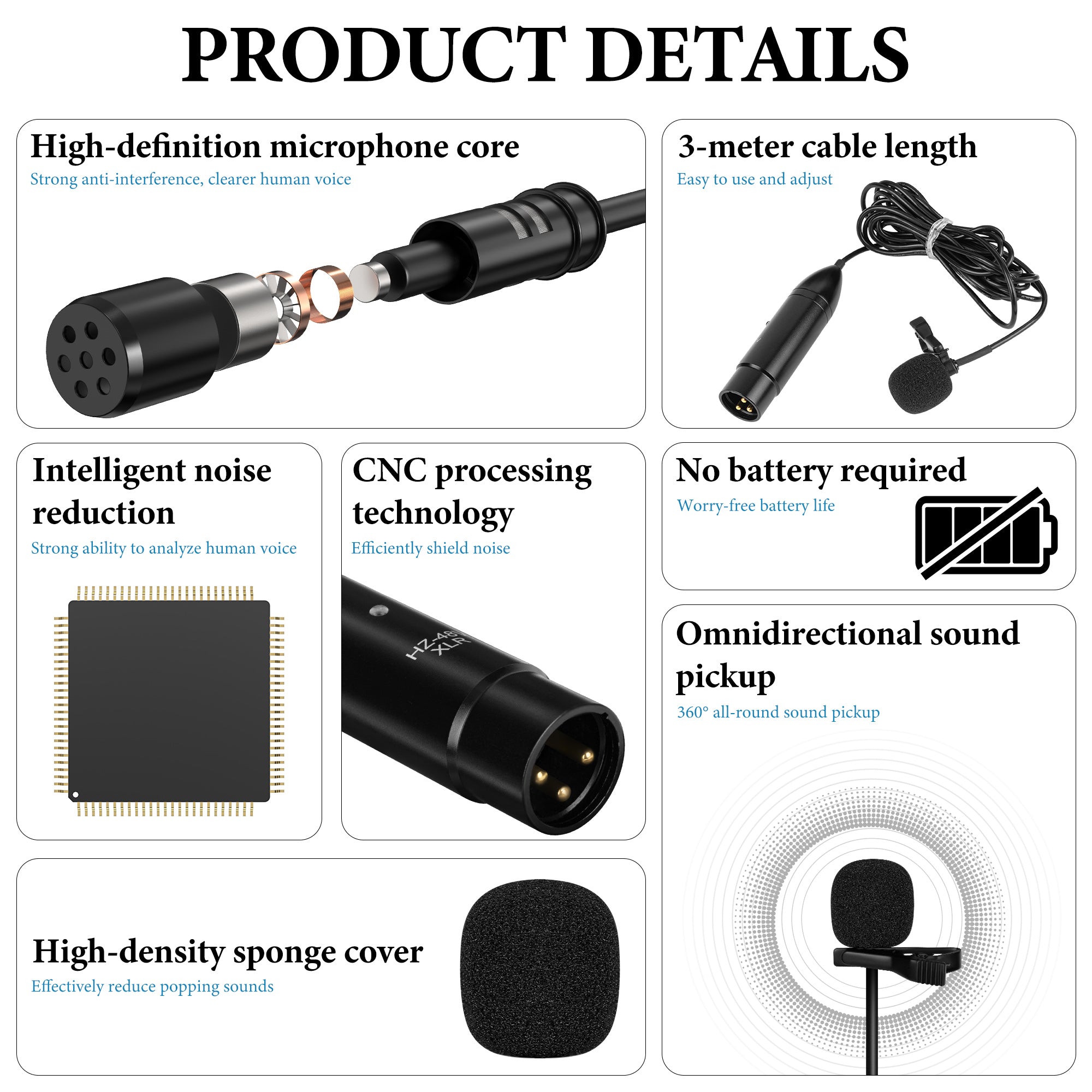 - XLR lavalier microphone features a high-definition microphone core with an omnidirectional pickup pattern and smart noise reduction for accurate and natural voice capture.
