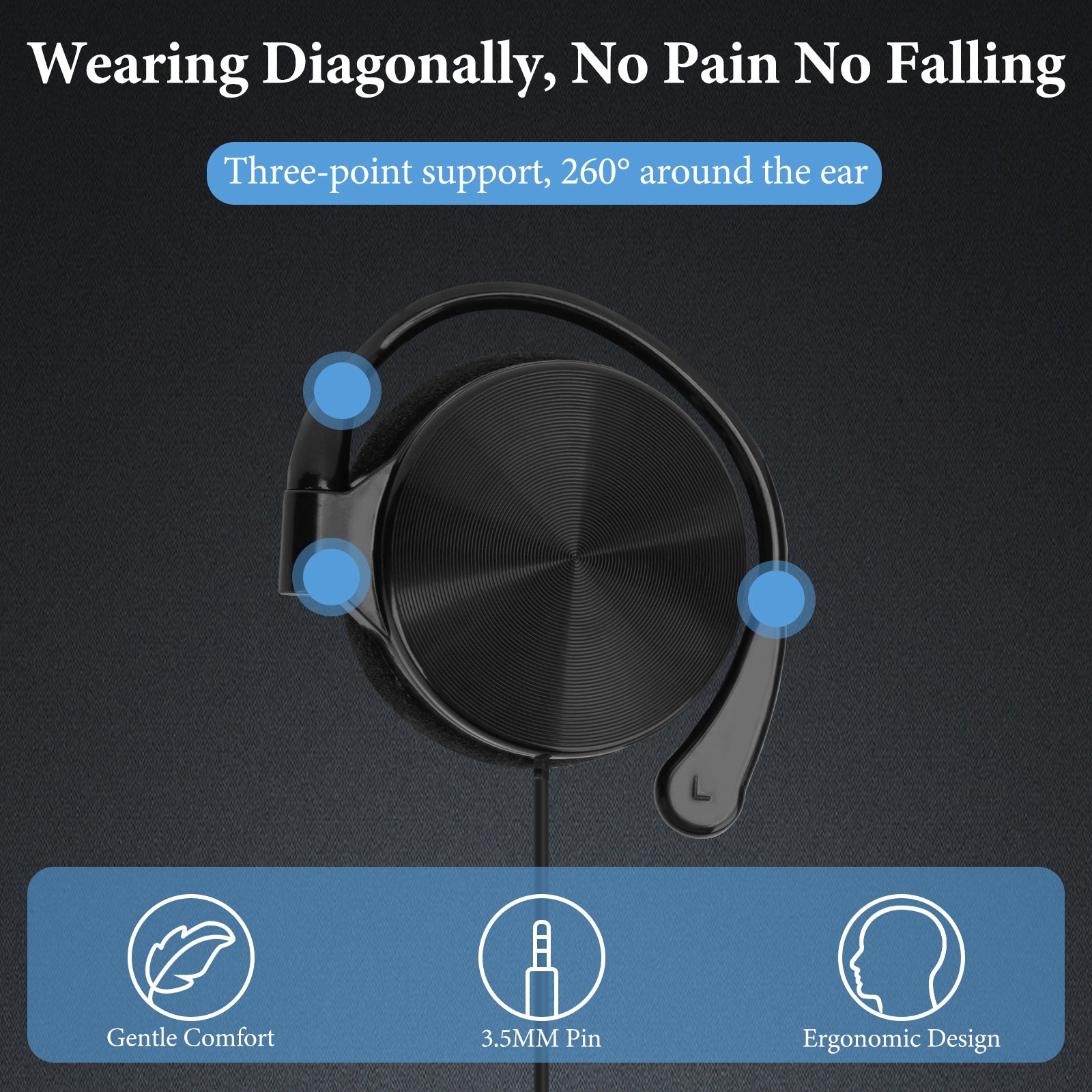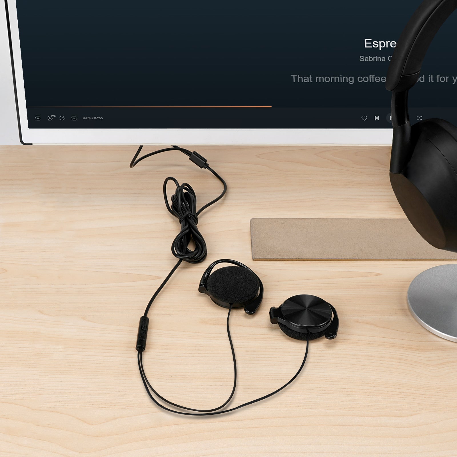 Geekria Wired Clip On Ear Headphones, Portable Hook On Ear Headphones with Microphone and Call Controller Compatible with Desktop Computer, Avoid Headphone Hair (Black)